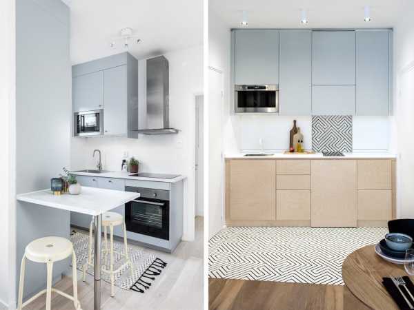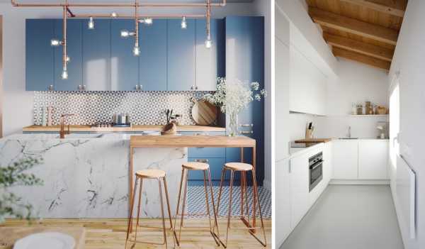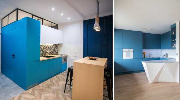 Интересное сочетание голубого цвета в различных стилях интерьера маленькой кухни