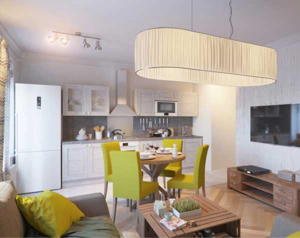 Для кухни гостиной особенно важно правильно подобрать освещение. Оно может использоваться, в том числе, для выделения столовой или зоны отдыха.