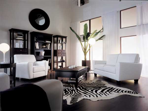 Зонирование производится расстановкой мебели. Центральную диванную группу образуют парные диваны, кресла и пуфы, размещенные широким периметром вокруг двух журнальных столиков.