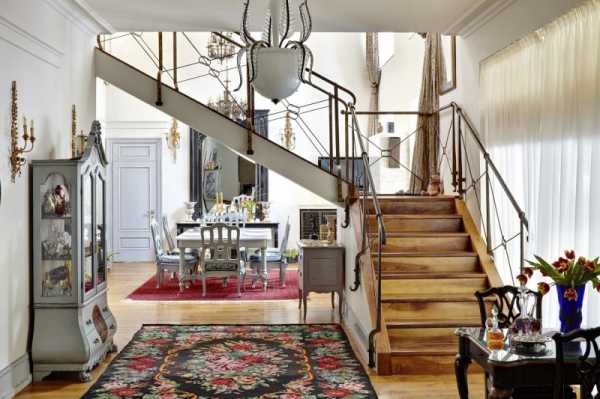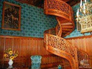 Винтовая лестница с богато украшенными резными перилами ассоциируется с замком из сказки.
