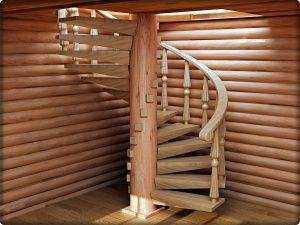 Такой дизайн винтовой лестницы сделает деревянный дом теплым и уютным. Массивный опорный столб и ступени создают ощущение надежности.