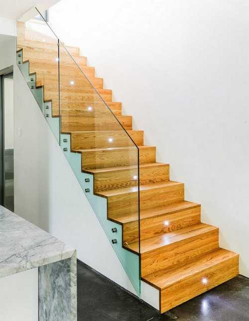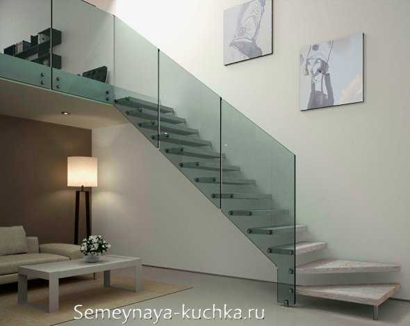 Ограждение на таких «парящих» лестницах может быть выполнено из стекла…