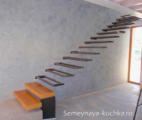 Пример такой комбинированной лестницы на второй этаж мы видим на фотографии ниже — висячие ступени зависли в воздухе (как в консольных конструкциях), но имеют дополнительное основание в виде установленного вдоль стены металлического косоура.