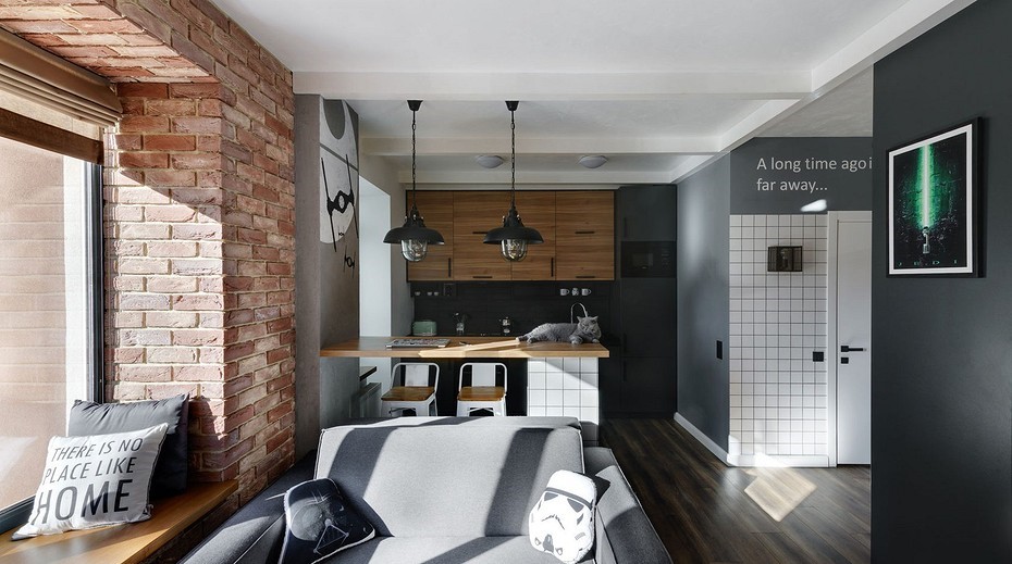 - Объединение кухни с жилым помещением. Квартиры-студии помогают сэкономить много места за счет отсутствия перегородки между кухней и гостиной. Вместо стены их могут разделять барная стойка или шкаф.