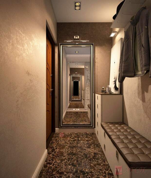 Замени шкаф на лаконичные крючки, а комод и табуреты – на вытянутую диван-скамью с ящиками или коробами для вещей внутри. Вместо столика с зеркалом в массивной раме подумай о целой зеркальной стене. Она визуально увеличит комнату практически вдвое и создаст эффект глубины.