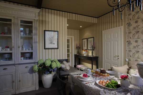 Если помещение имеет слишком высокие потолки, то стены можно делить и по горизонтали. Две или три полосы, которые чередуются, визуально уравновесят вертикальную плоскость. Этот прием свойственен всем стилям.