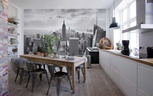 Не стоит также забывать о популярных нынче фотообоях. Ими можно выделить стену (чаще всего в обеденной зоне) и украсить интерьер роскошным пейзажем, видом старого города или натюрморта.
