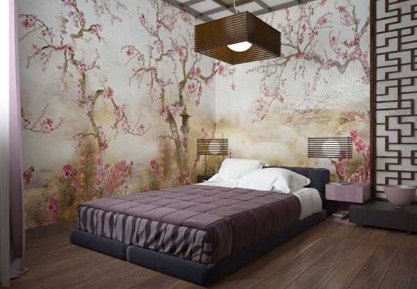Интерьер спальни, напоминающий о стране восходящего солнца, можно оформить, используя бамбуковые обои, обои с рисунками иероглифов, цветущей сакуры, листьев бамбука, вееров, а также фотообои. Палитра оттенков для японского стиля довольно широкая — от черно-белых, серых, древесных, соломенных тонов до золотистых, ярко-розовых и красных.