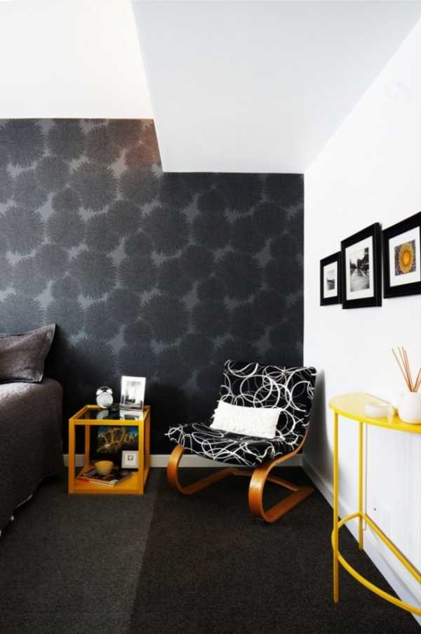 Черный цвет хоть и считается мрачным, однако в некоторых сочетаниях способствует расслаблению и умиротворению. Выбирайте для спальни черно-белые, черно-серые, черно-золотистые обои с узорами и принтами или используйте одну из комбинаций обоев – горизонтальное комбинирование по типу панелей, вертикальное комбинирование (подойдет для комнат с низкими потолками) или выделение контрастным цветом одной из стен.