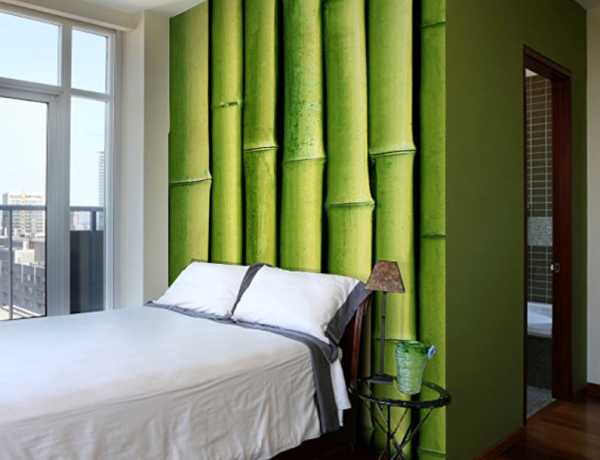 Прекрасно подходят для отделки стены у изголовья бамбуковые и тканевые покрытия