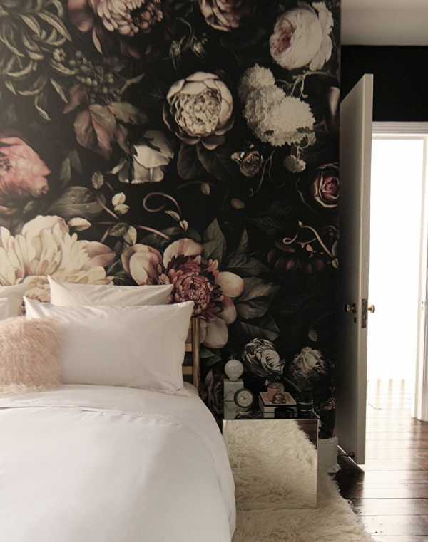 Черные обои с крупным рисунком — центр притяжения взглядов для этой комнаты