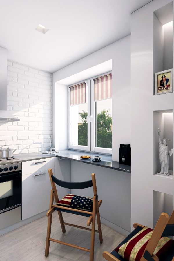 Небольшие размеры кухни не позволяют организовать в ней обеденную зону, поэтому подоконник заменили на широкую столешницу из искусственного камня, за которой можно удобно перекусить или даже пообедать.
