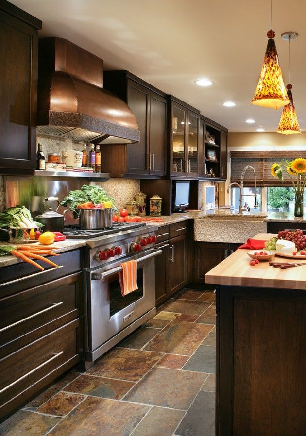 Камень — материал похожий на плитку, но он лучше сохранит тепло и добавит вашей кухне неповторимый, изысканный внешний вид. Вы можете выбрать мрамор или гранит — он придаст элегантности кухни, а известняк намекнет на деревенский стиль вашего интерьера. Помните, камень должен иметь дополнительную защитную обработку.