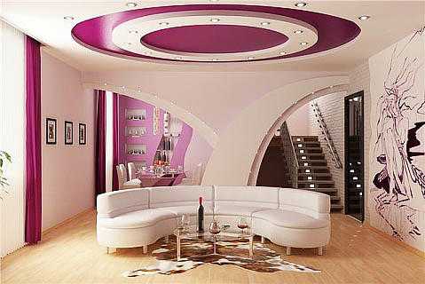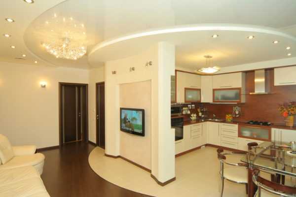 - сделать потолки в гостиной, совмещенной с кухней, грамотно по современным меркам;