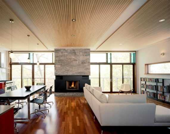 Внешне, подобные решения могут выглядеть как одноуровневые конструкции, так и быть более сложными – с несколькими ярусами. Покрытие представляет собой плоскость, собранную из множества отдельных элементов и поэтому, часто имеет четко выраженный геометрический рисунок. Ниже приведены фото примеры того, как выглядят потолки в гостиной, совмещенной с кухней, собранные из панелей или реек.
