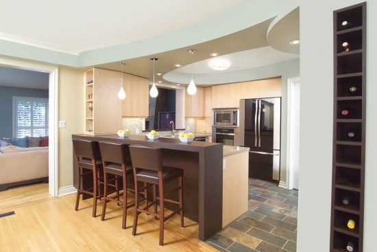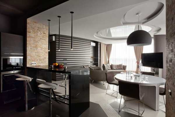Часто архитекторы намеренно создают планировку с объединенной кухней ради увеличения спроса. Это модное течение, многие владельцы оценили достоинства такого варианта. Но придумать, как сделать потолок, задача, которая по силам людям с врожденным хорошим вкусом и профессиональным дизайнерам. Ведь здесь ставится не один вопрос: