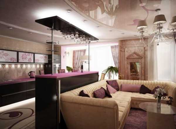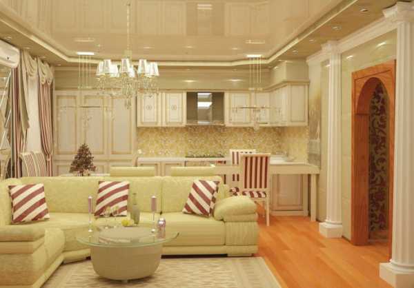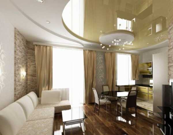 Натяжные потолки в гостиной совмещенной с кухней: фото примеров