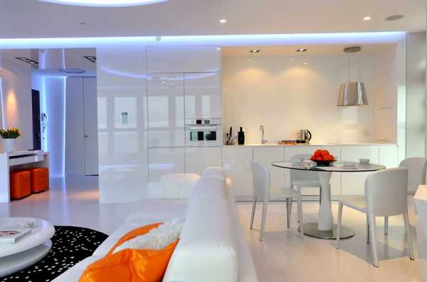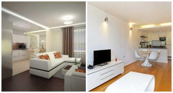 - Освещение. Кухонная зона нуждается в большем количестве света и желательного с применением LED-ламп. Гостиная часть обычно требует большего комфорта и приглушенных светильников, обычно принимаются решения вариативности.
