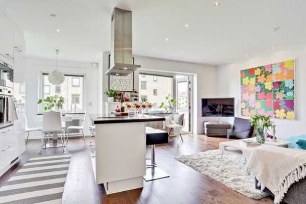 Довольно часто такое решение считают возможным и удачным при малой площади кухни и зала. На практике такие чаяния оправданы лишь в том случае, когда кухня носит характер скорее номинальный и сводится к мойке, микроволновке, холодильнику и кофеварке. В остальных случаях кухонное оборудование и мебель немедленно занимают большую часть площади, превращая помещение в очень скромную столовую-кухню.