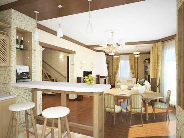 Стремясь сделать свой дом комфортнее, многие совмещают площадь гостиной с площадью кухни, получая большое объединенное пространство. Очень важную роль в оформлении гостиной, совмещенной с кухней, играет дизайн потолка. Отделка перекрытия в этом случае, может выполнять как чисто декоративную функцию, так и служить своеобразным разделителем площади комнаты и зоны приготовления пищи.
