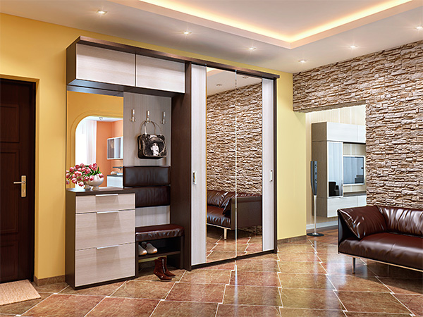 Оптимальным решением проблемы хранения большого количества разнообразных вещей может стать шкаф-купе. Современные технологии позволяют сделать его отдельным арт-объектом, своеобразной эстетической доминантой прихожей. Все зависит от общего стиля помещения: можно выбрать дверные полотна из ротанга, бамбука, а можно заказать зеркальные или матовые стеклянные поверхности. Интересный вариант – нанесение на поверхность орнамента или тематического изображения, соответствующего общей эстетической концепции комнаты.