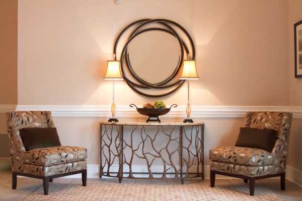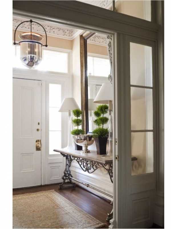 - Повесьте зеркала без громоздкой резной оправы, поставьте узкую двухместную банкетку с полкой для обуви, чтобы было куда присесть, снимая сапоги.