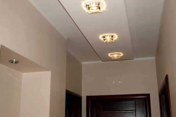 Маленькая прихожая в хрущевке квадратной формы – это полбеды. Гораздо проблематичнее, если она длинная и узкая. Скорее всего, она еще и темная. Такое пространство лучше разделить на зоны с помощью потолочных конструкций.