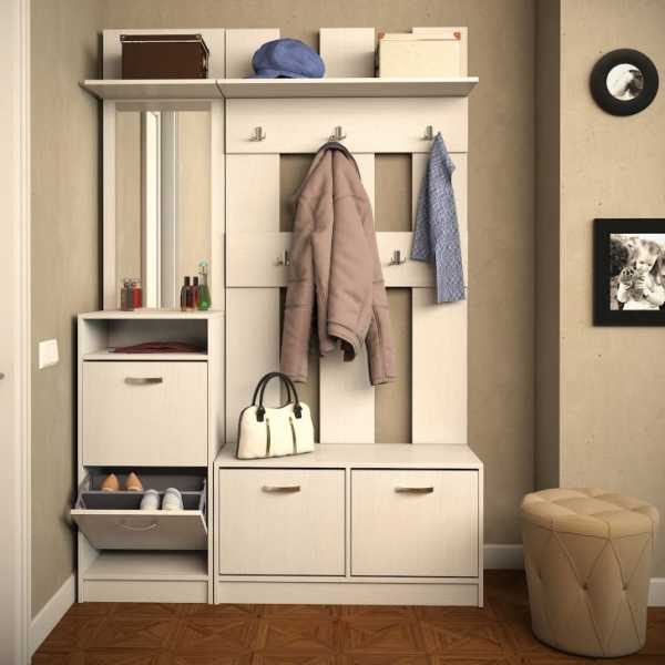 Всю одежду, которая не носится в данном сезоне, лучше убрать в шкаф, который придется установить в спальне или гостиной. Обувь убрать в закрытую обувницу, чтобы она не захламляла и без того небольшое пространство.