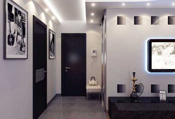 Дизайн прихожей в малогабаритной квартире будет очень стильным, если натяжной потолок будет выполнен из глянцевого полотна. К нему подойдут мелкие точечные светильники, расположенные не по периметру, а по центральной продольной линии.