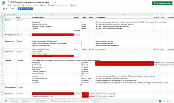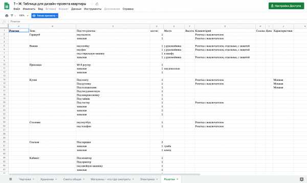 Перед тем как делать схему, мы сделали список всех розеток в таблицеЕще на схеме надо указать выводы под интернет, телевизионный кабель и стационарный телефон, если он у вас есть.