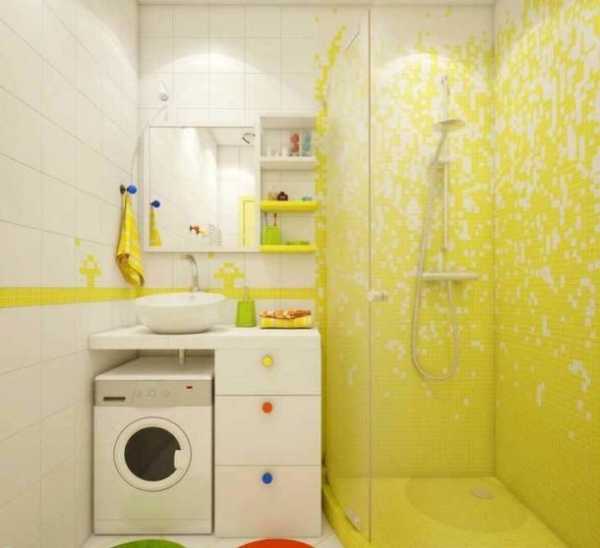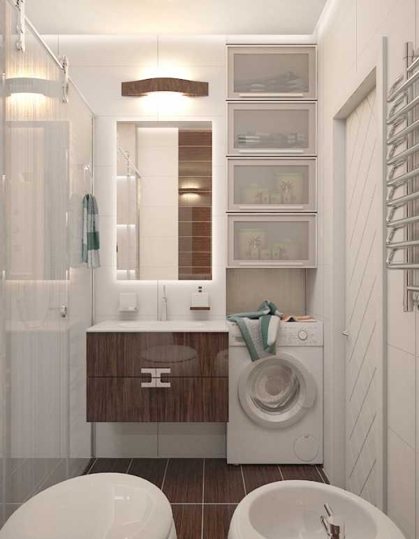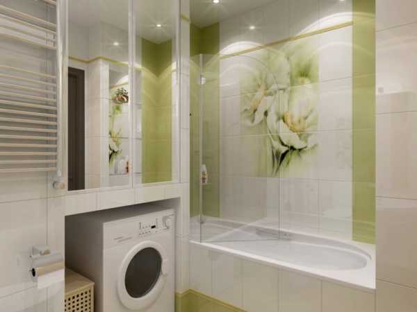 Ванная 2 на 2 или 1,5 на 1,3 квадратных метра может вместить стиралку, но пространство будет катастрофически мало. Выход из ситуации – над машинкой установить стеклянные полки для различных предметов. Прозрачность стекла позволит свету проходить насквозь, что даст объем. Отличным решением станут зеркала в нескольких местах.