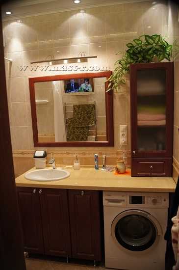 Здесь так же мы придерживаемся общего стиля и расцветок! Столешница изготовлена из искусственного акрилового камня бежевого цвета, а шкафы из натурального дерева – тёмная вишня. Под столешницей установлены не только шкафы, но и компактно вместилась стиральная машина. Классика — это красиво, но нельзя забывать о необходимой технике. На столешнице также установлен шкаф, придавая оригинальность данному дизайну и в тоже время — нужное место в ванной комнате куда можно спрятать необходимую косметику, средства личной гигиены и т.д..