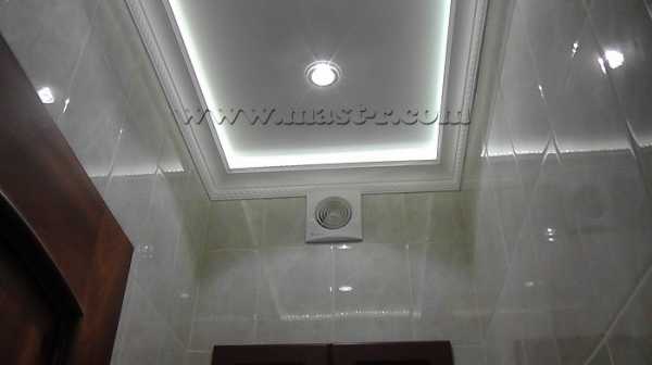 Высота потолка в этом раздельном санузле — 3 метра. Дизайн потолка в ванной комнате, отличается от потолка в туалете. В ванной комнате потолок двухуровневый и светодиодная лента подсвечивает верхний уровень потолка, но точечные светильники установленные на нижнем уровне , в основном освещают стены! А в санузле основные — точечные светильники расположены по центру потолка, а светодиодная лента закреплена на декоративный молдинг.