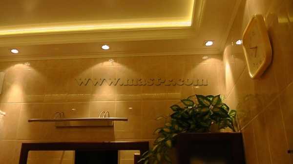 В маленькой ванной лучше использовать встроенные точечные светильники.