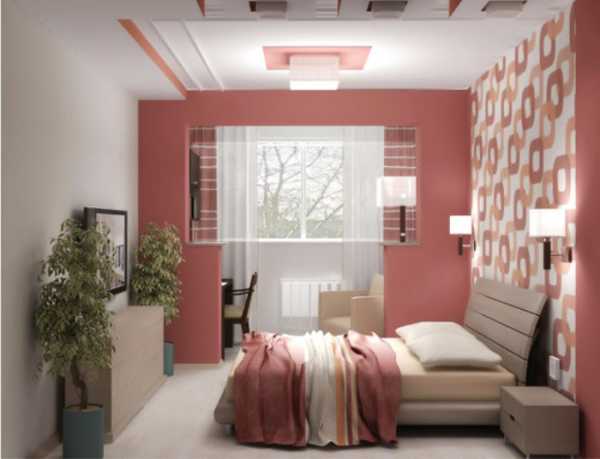 Дизайн прямоугольной спальни, фотоМногие убеждены, что красному цвету не стоит отдавать предпочтение в спальной комнате. Однако, разнообразие оттенков очень большое, поэтому можно выбрать вариант, который не будет раздражать нервную систему жильцов.