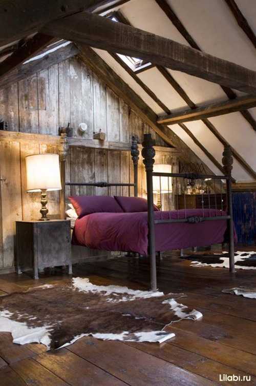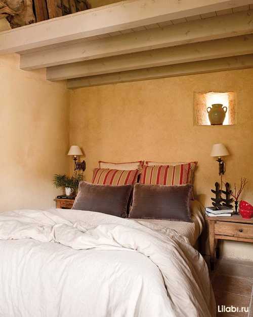 Хороший вариант – спальня в деревенском оформлении. Комната смотрится просто, у неё есть своё стилистическое направление, а главное, общий вид является расслабляющим и уютным.
