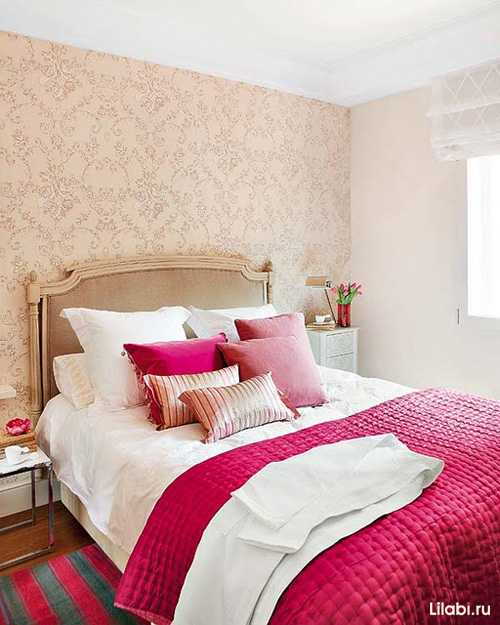 Фото спальни с бежевыми обоями и ярким пледом цвета фуксия. Белое пастельное бельё и розовые подушки служат прекрасным дополнением к дизайну кровати. Изголовье выполено из мягкой обивки цвета кофе с молоком.