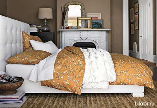 Фото дизайна спальни в современной классическом стиле. Кровать с мягким изголовьем стоит в середине комнаты и имеет дополнительной место сзади. Цвет стен серо-коричневый с белыми наличниками и камином. Пастельное бельё цвета кукурузы.