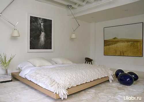 Фото спальни в стиле минимализм. Низкая кровать, мягкое белоснежное ковровое покрытие, постеры с пейзажами водопада и поля — прекрасный интерьер для любителей простоты.