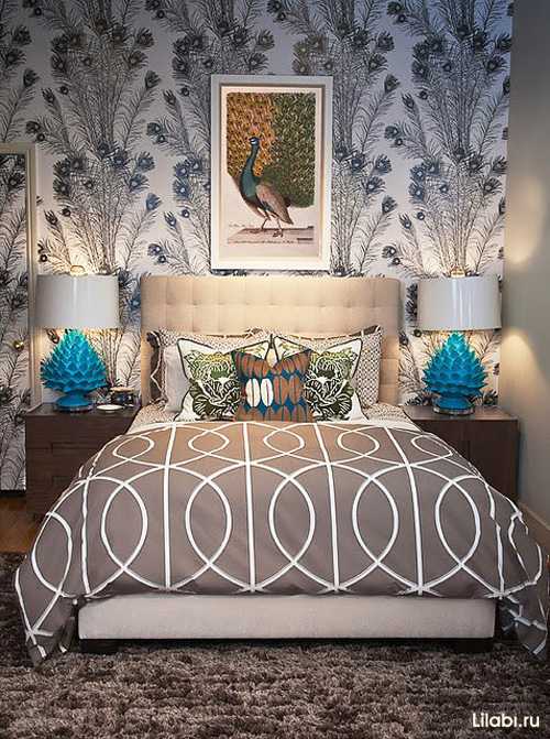Дизайн спальни с необычными обоями с рисунком павлиньих перьев. Покрывало серо-сиреневого цвета с ярким белым геометрическим узором отлично сочетается с подушками, выполненными из других тканей. Яркие голубые лампы дополняют интерьер и придают ему яркости.