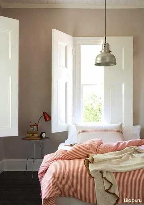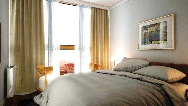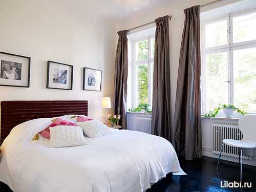 В небольших спальнях массивные шторы и гардины могут отяготить общую обстановку, поэтому стоит осторожно выбирать занавески. Лучше всего подойдут такие шторы, как римские, японские, жалюзи. Существуют рамы для окон со специальными карнизами, прикрепленными прямо к раме, на которые вешаются маленькие занавески. Еще можно повесить штору на карниз, прикрепленный непосредственно в оконном проеме.