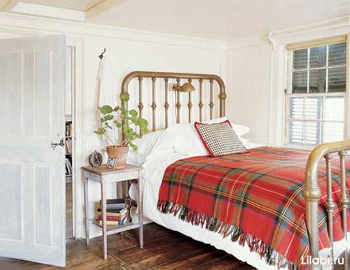 Дизайн спальни в стиле кантри. Красный шерстяной плед в клетку стал прекрасным ярким акцентом. Полы из натурального дерева красивой фактуры.
