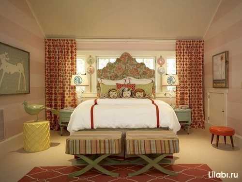 Фото спальни в стле поп-арт. Яркие цвета красно-оранжевых оттенков прекрасно вписались в дизайн спальни, потому как использовались в небольшом количестве и не брались в чистом виде. Необычный текстиль подчеркивает дух 60-х, 70-х годов и стиль поп-арт.