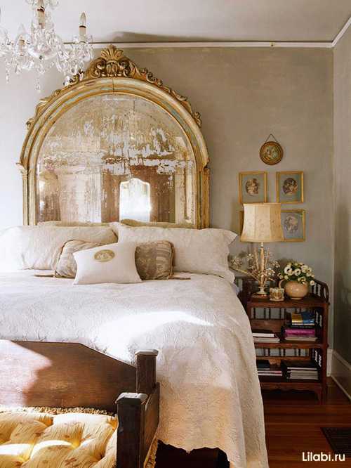 Фото спальни с зеркальным изголовьем. Старое потертое зеркало в багете гармонирует с другими золотистыми элементами декора.