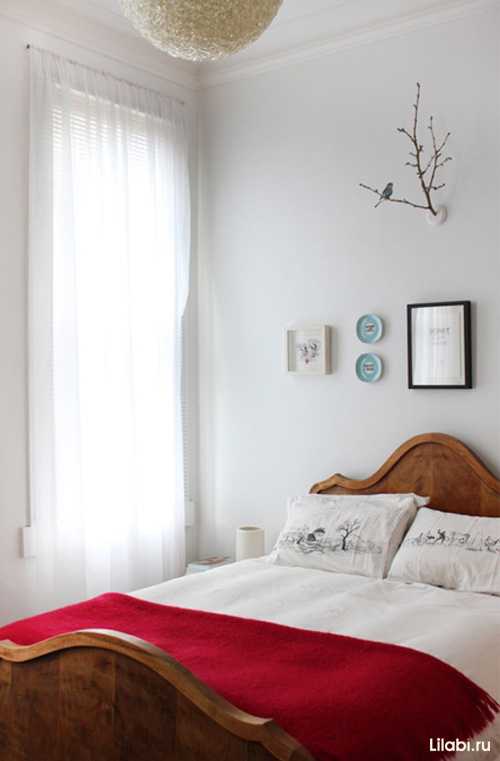 Фото спальни в скандинавском стиле. Светлые стены прекрасно сочетаются с деревянными поверхностями кровати. Яркий красный плед стал отличным дополнением к дизайну спальни.