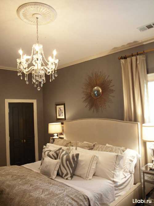 Безусловно, в малогабаритной спальне не последняя роль отводится освещению, ведь даже небольшая площадь должна быть правильно освещена. Это можно осуществить с помощью светильников либо небольшой подвесной люстры, однако здесь важно, чтобы высоты потолка хватало для такой лампы.Помните! Если в комнате есть рабочая зона, обязательно нужно установить в ней дополнительный источник света, помимо потолочного освещения.