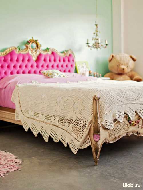 Фото спальни для принцессы. Дизайн спальни в романтическом стиле с ярким мягким розовым изголовьем. Эта спальня отлично подойдет для девочки.