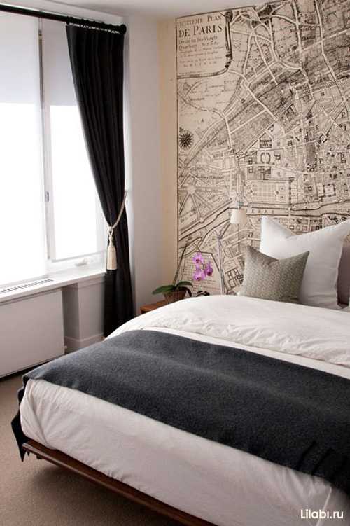 Фото спальни в серой цветовой гамме. Здесь есть серые цвета различных оттенков от светлого до почти черного. В дизайне спальни использованы фотообои со старой картой Парижа.
