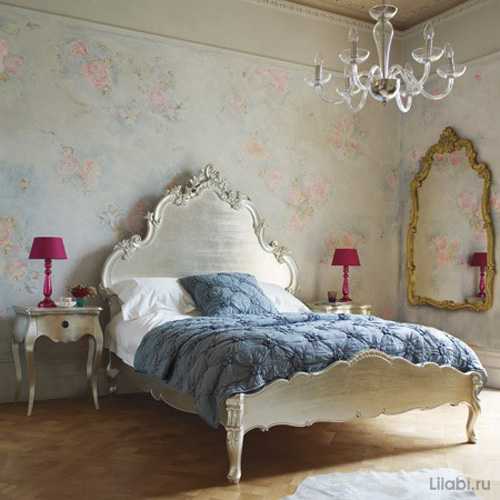 Фото спальни в стиле прованс. Огромное зеркало повторяет рисунок изголовья. Изящные прикроватные столики дополнены яркими лампами цвета фуксия.