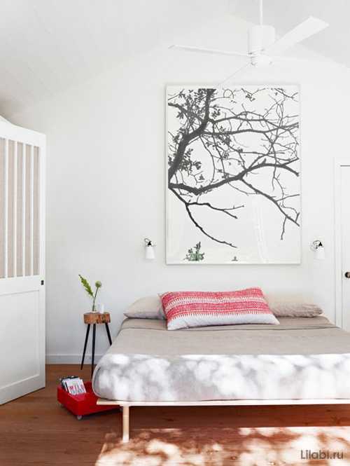 Фото спальни в скандинавском стиле с типичными белыми стенами искромной мебель. Полы — натуральное дерево. Легкая картина с ветками дерева прекрасно дополняет дизайн спальни. Светлая и солнечная спальня с маленьким количеством мебели.